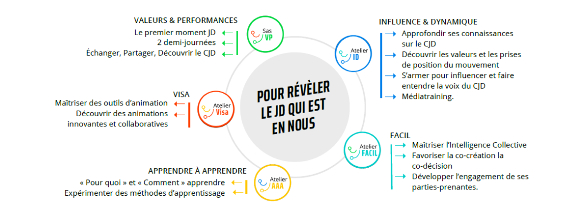 Articulé autour d’un SAS d’entrée et de 5 ateliers, le « Parcours » du JD s’inscrit dans l’ADN du mouvement et représente une clé essentielle d’intégration pour ses membres. Entièrement gratuit, conçu et animé par les JD, il leur fait découvrir de nouveaux outils, des postures et des méthodes qu’ils pourront ensuite mettre au service du CJD et de leur entreprise. Ces modules sont aussi des moments importants d’échanges et de partage entre JD sur des idées ou problématiques du quotidien.