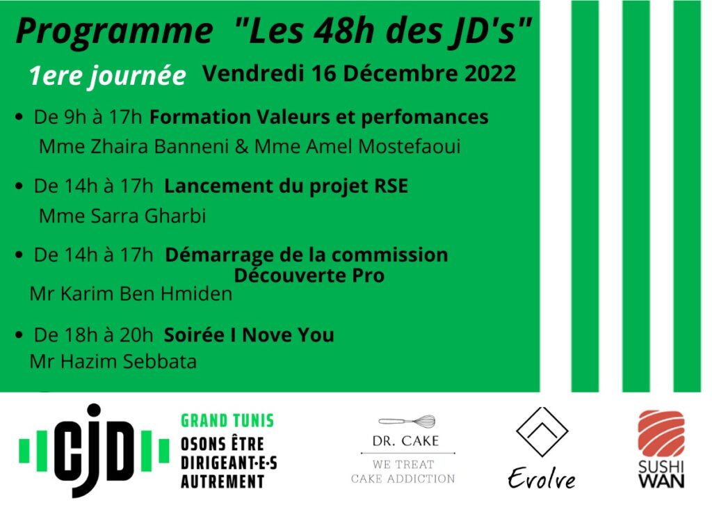 48h de partages, 48h d’apprentissages, 48h d’émotions. Voilà à quoi ressemblait le dernier évènement organisé par le CJD Grand Tunis, regroupant ses membres autour de 2 journées de formation, d’ateliers d’échanges, de moments de jeux et de découverte. Le tout dans une ambiance chaleureuse décontractée, et bien sûr professionnelle. Un grand bravo aux organisateurs et à un énorme MERCI à nos invités et les participants sans qui, la réussite de ces journées n’aurait pas été possible.